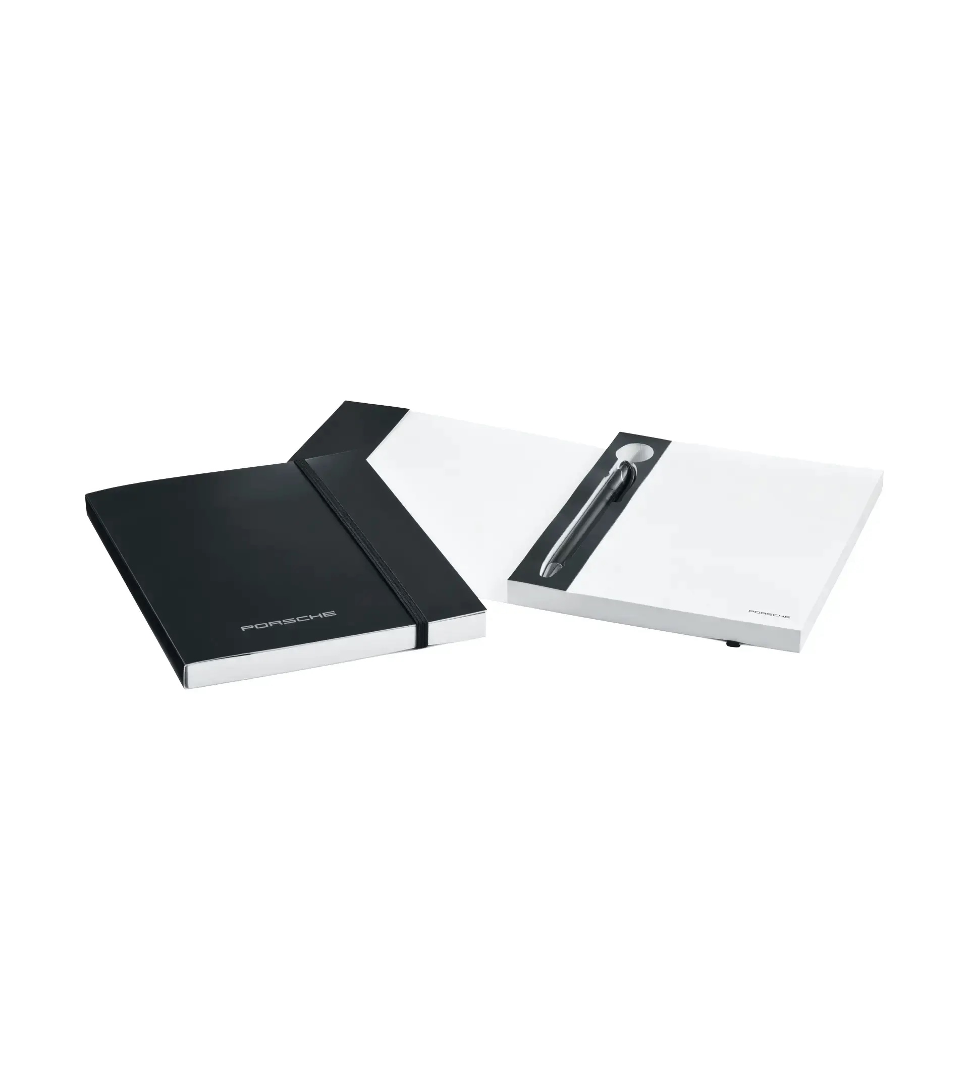 Caderno com 100 páginas brancas perfuradas com o discreto logo da Porsche.
