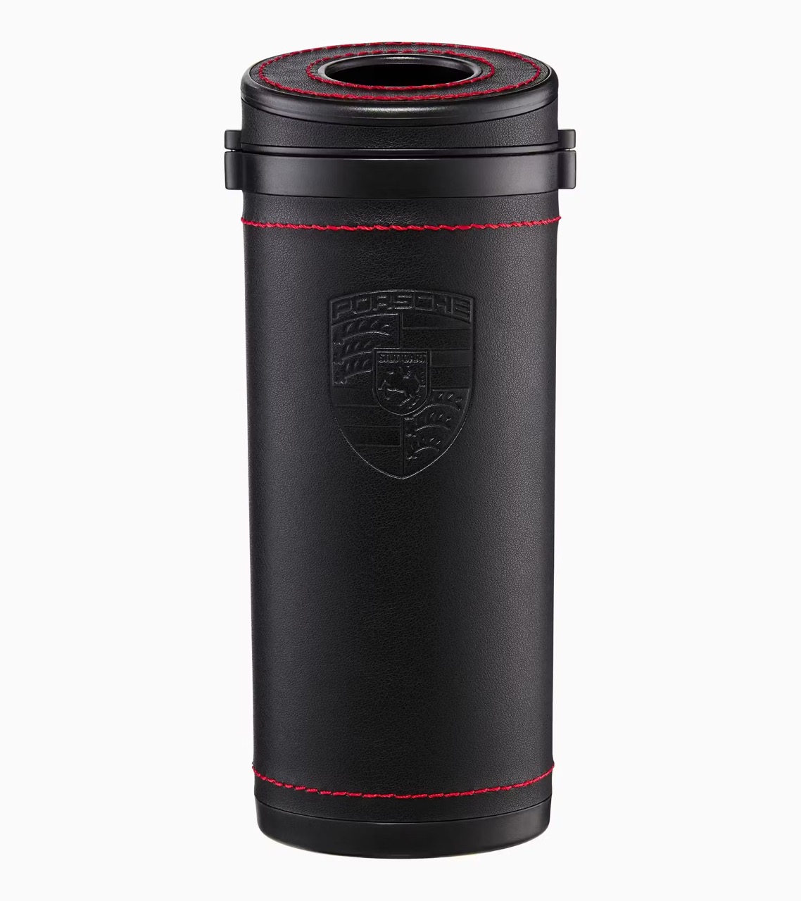 Sempre a mão: O porta lenços Porsche tem o formato ideal para o porta copos de qualquer carro. Seu design único em couro preto e costura contrastante em vermelho vai deixar o interior de seu veículo ainda mais elegante. O escudo Porsche gravado em relevo complementa seu visual